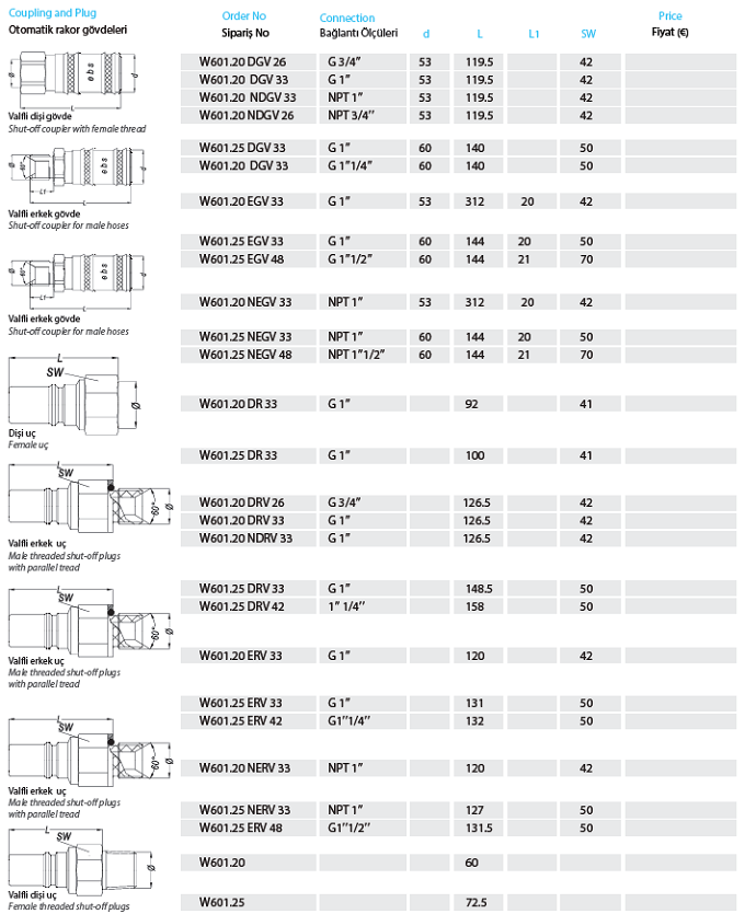 * W601 kaplinlerde Fluorocarbon FPM (V) conta kullanılmaktadır.