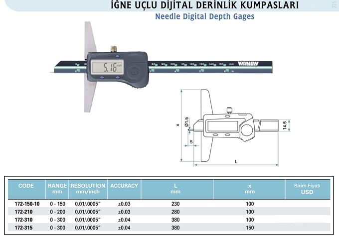 Dijital Derinlik Kumpası İğne Uçlu KANON 172-xxx |