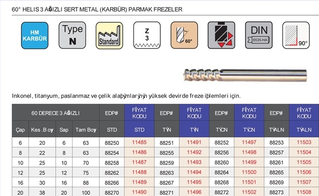 60º HELIS 3 AĞIZLI SERT METAL (KARBÜR) PARMAK FREZELER |