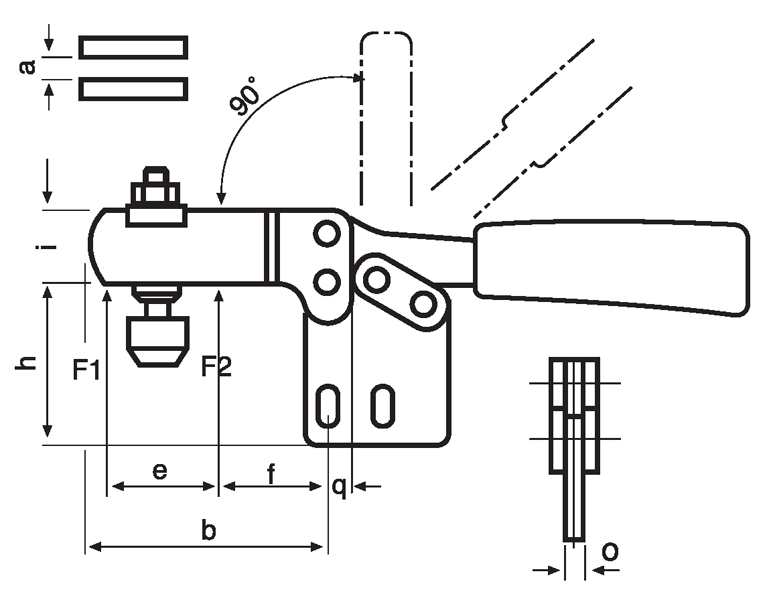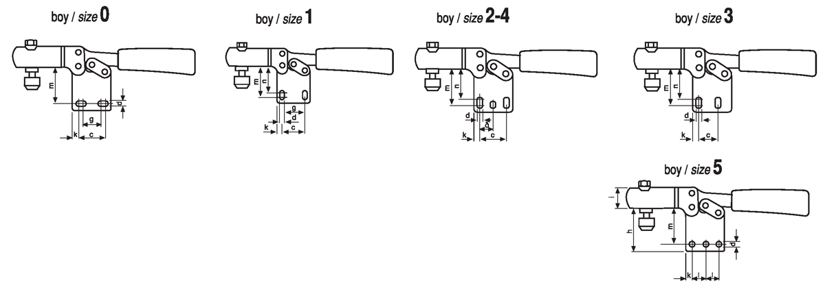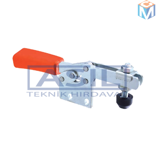 Galvaniz kaplı, kırmızı renkte ve yağa mukavim plastik tutma saplı, sertleştirilmiş ve yağlanmış yataklama burçlu. Baskı civatası ve koruyucu lastik başlık ile birlikte komple. çizmak Horizontal acting toogle clamps Zinc plated, with red oil resistant pastic handle, bushes case hardened and greased, supplied complete with clamping screw and rubber nose |