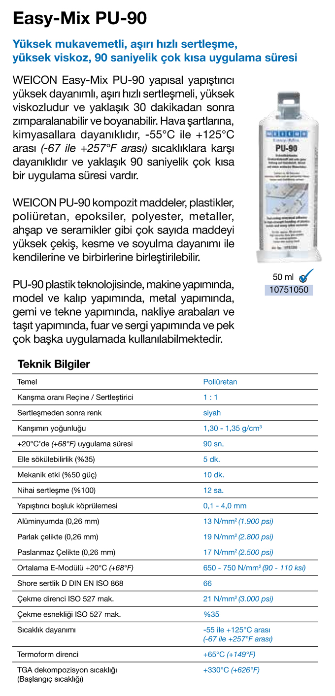 WEICON Easy-Mix PU-90 yapısal yapıştırıcı yüksek mukavemetli, aşırı hızlı sertleşmeli, yüksek viskozludur ve yaklaşık 30 dakikadan sonra zımparalanabilir ve boyanabilir. Hava şartlarına, kimyasallara dayanıklıdır, -55°C ile +125°C arası (-67 ile +257°F arası) sıcaklıklara karşı dayanıklıdır ve yaklaşık 90 saniyelik çok kısa bir uygulama süresi vardır.