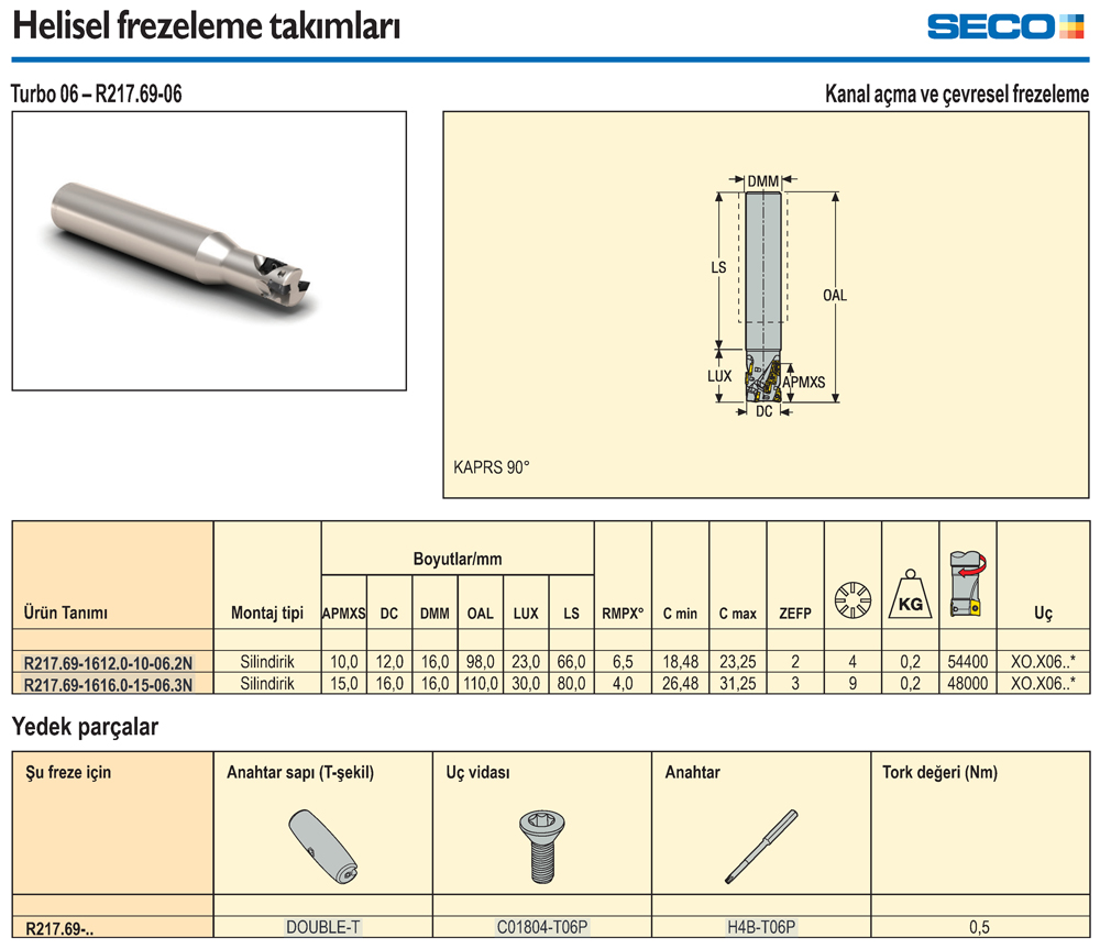Turbo 06 R217.69 Silindirik Kanal Açma ve Çevresel Frezeleme Helisel - SECO |