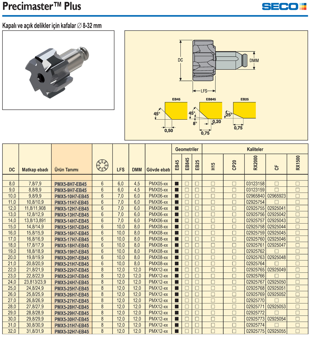 Ø8-32mm Kapalı ve Açık Delikler için Kafalar Precimaster Plus - SECO |