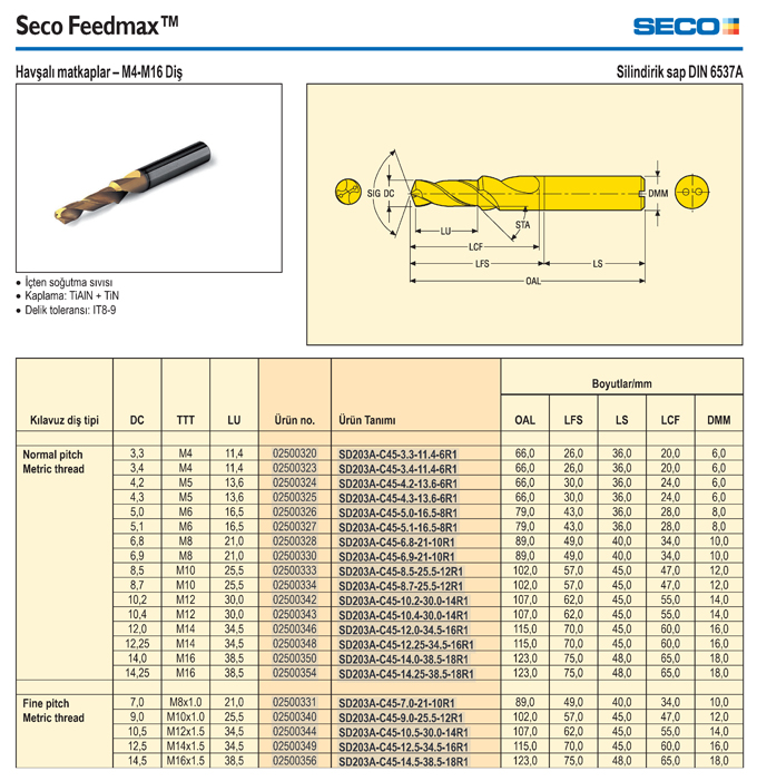 M4-M16 Diş DIN 6357A Havşalı Matkaplar Seco Feedmax - SECO |