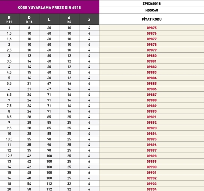 KÖŞE YUVARLAMA FREZE DIN 6518 - ZPS |