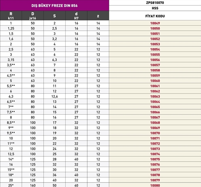 DIŞ BÜKEY (KONVEKS) FREZE DIN 856 - ZPS |